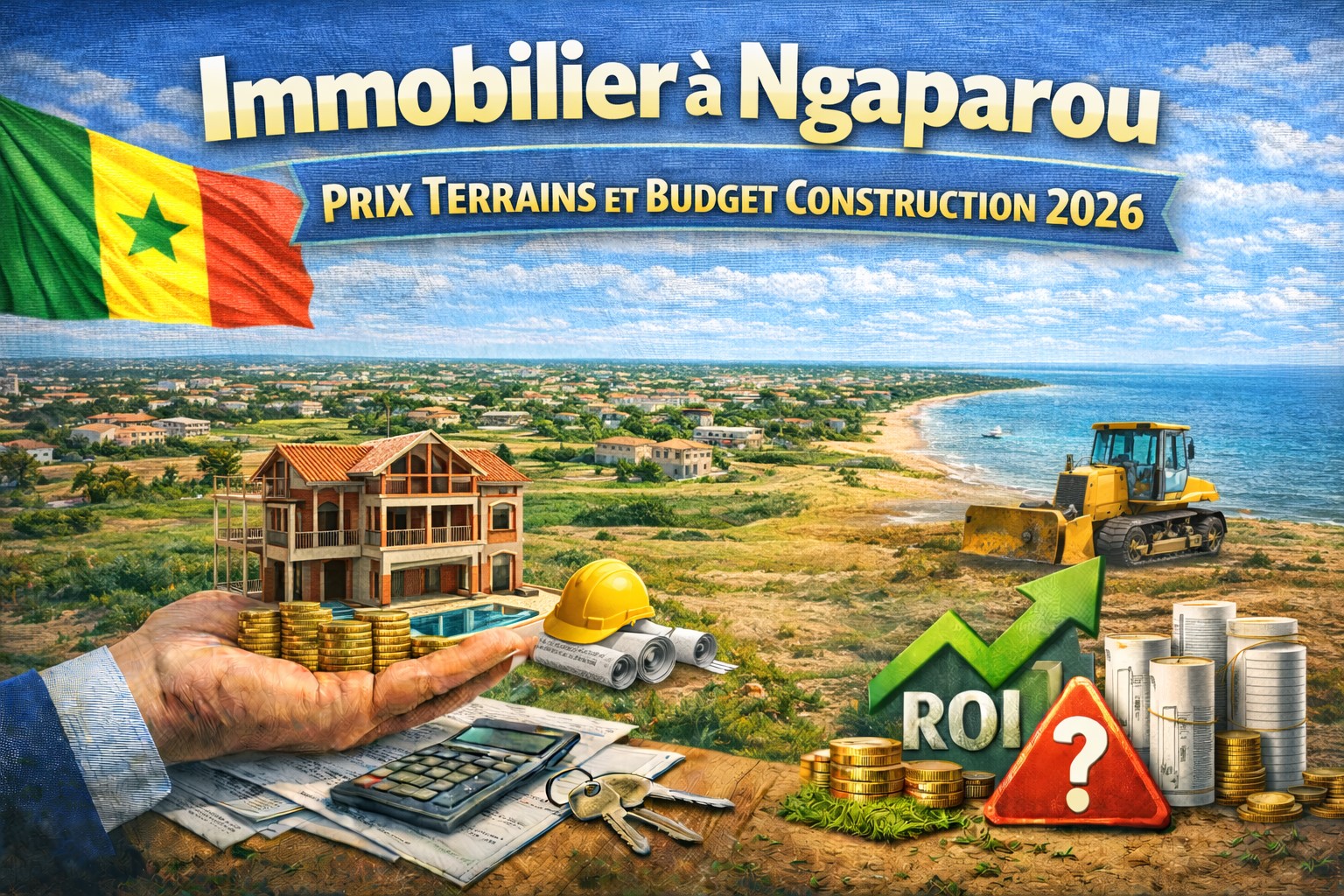 Investir dans l’immobilier à Ngaparou demande aujourd’hui une planification financière rigoureuse. Pour un projet de villa standard (3 chambres, piscine, sur 300 m²), le budget réaliste en 2026 oscille entre 75 000 000 FCFA et 120 000 000 FCFA. Ce montant inclut l’achat d’un terrain titré (environ 25 à 45 millions selon la distance de la mer) et une construction de standing (environ 450 000 FCFA/m² bâti). La rentabilité est assurée par une forte demande locative saisonnière et résidentielle, Ngaparou étant devenu le refuge calme de la Petite Côte. Il est crucial de passer par un notaire reconnu par la Chambre des Notaires du Sénégal pour authentifier l’acte de vente et vérifier l’état des droits réels auprès de la DGID.